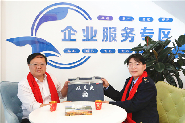 孪井滩税务分局开展“元旦税语 企新对话”活动,青年税干们满怀热情,走进办税服务大厅向前来办业务的纳税人缴费人问需求、讲政策、送祝福,并送上精心准备的政策礼包,邀请纳税人缴费人拍照打卡,共启新元、同贺美好。(拍摄者:王彦锦)
