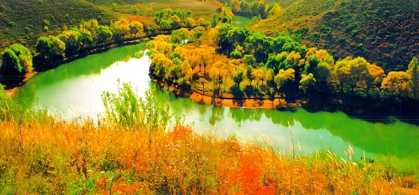 位于鄂尔多斯乌审旗的萨拉乌苏河如翡翠丝带般蜿蜒于鄂尔多斯高原的丘陵之间,澄澈的水面倒映着两岸斑斓的林木。秋季的植被呈现出绿、黄、橙等丰富色彩,山坡上的草甸也染上了金黄与翠绿的层次,整个画面静谧而秀美,尽显萨拉乌苏河独特的生态风貌与地理神韵,这里不仅是自然胜境,更是承载着古人类文化与地质历史的重要区域。(张月容)