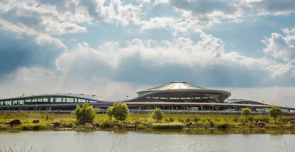 在鄂尔多斯空港物流园区,伊金霍洛国际机场展现出极具现代感的建筑风貌,流线型的屋顶设计如展翅的雄鹰般富有动感。机场前的湖水澄澈,岸边绿树依依、草色青翠,自然与建筑的融合,既彰显了空港的大气,又蕴含着草原之城的灵动韵味。(常俊鹏)
