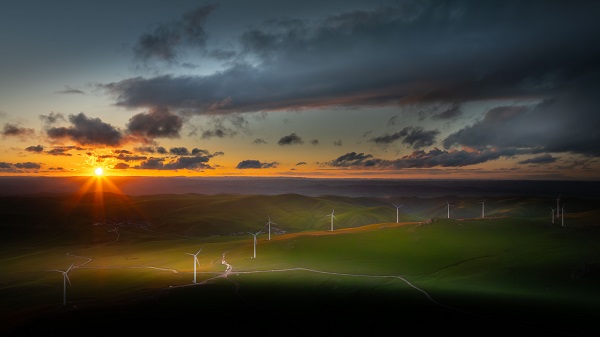 在准格尔经济开发区的草原上,落日熔金,云霞似火。一座座白色风车伫立在起伏的绿丘间,如大地的白色音符。蜿蜒的道路在光影里延伸,这一刻,自然的壮美与新能源的律动在此交融,绘就出准格尔旗独特的生态与发展共舞的画卷。(图:王晓明 文:王镕)