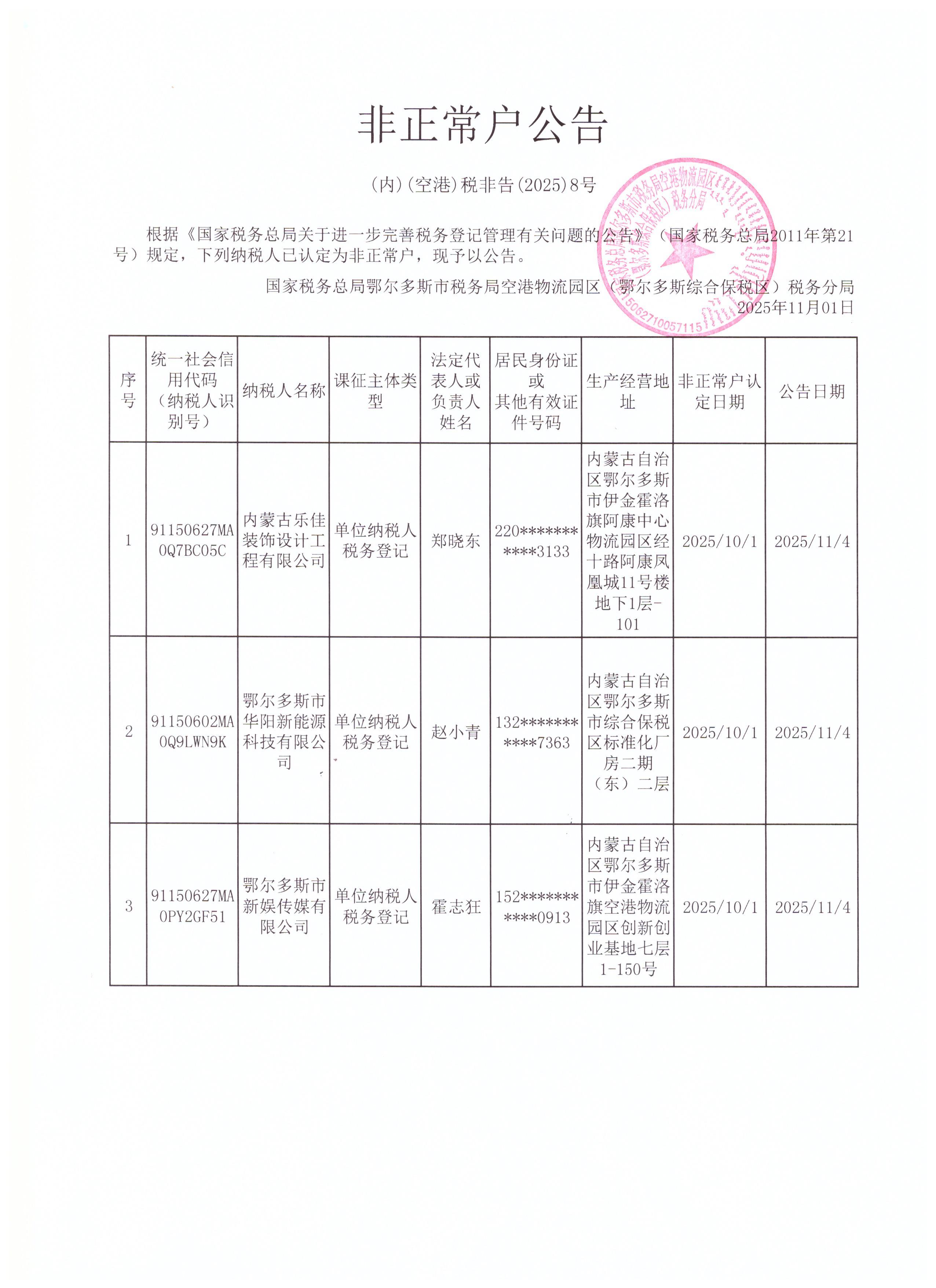 国家税务总局鄂尔多斯市税务局空港物流园区(鄂尔多斯综合保税区)税务分局非正常户公告(2025年11月)