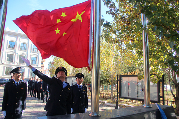 国庆节假期后首个工作日,满洲里市税务局举行庄严的升国旗仪式。市局党委书记、局长马国智,市局领导班子成员,及干部职工参加仪式。