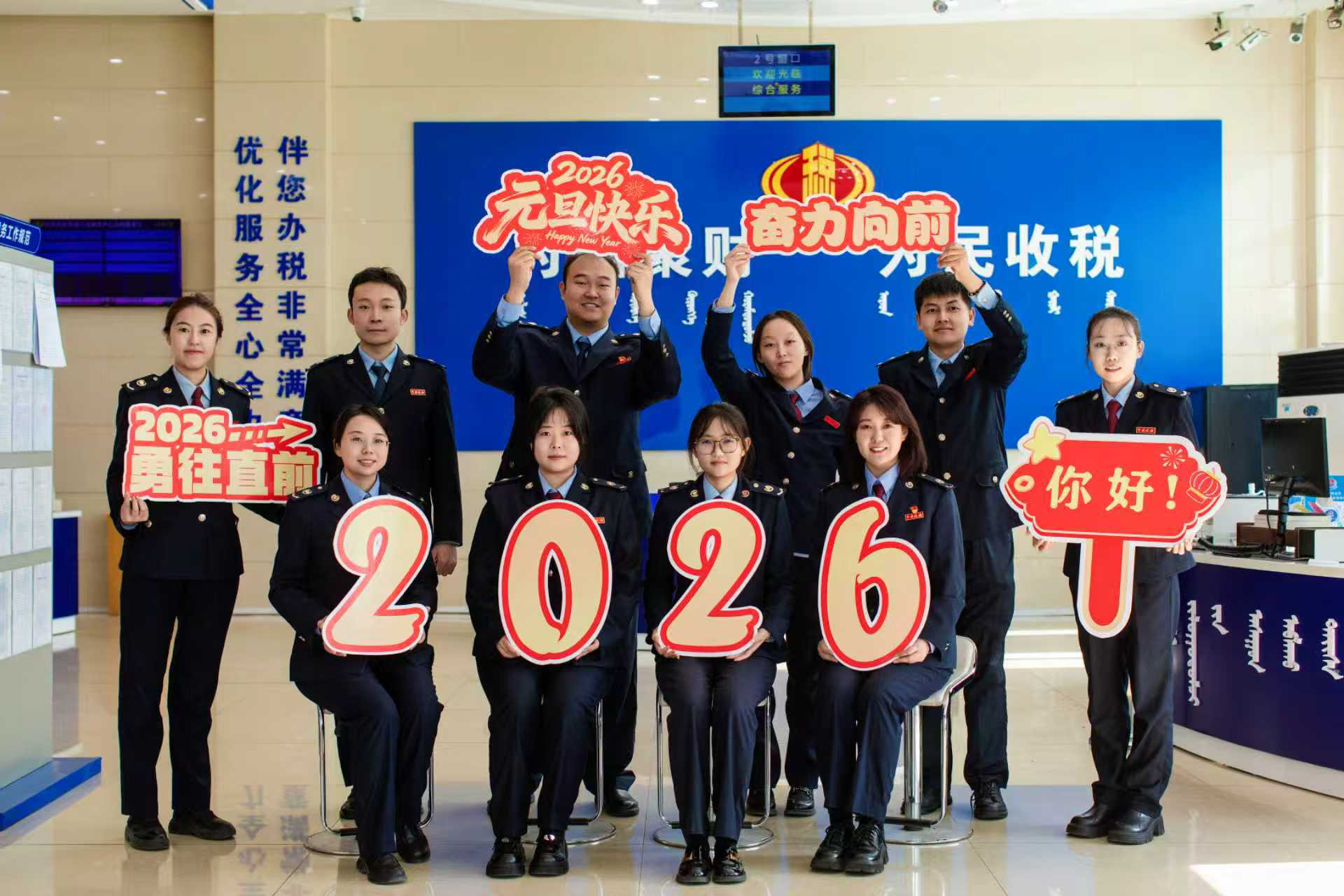 身着税装,笑意满盈!国家税务总局乌海市海南区税务局的青年干部们,以“为民收税”为底色,将“优化服务”的热忱揉进新年笑意里,在办税服务厅定格下2026开篇的奋进模样。一句句温暖的“新年快乐”,传递出税务人坚实而绵长的服务温度。(赵艳艳)