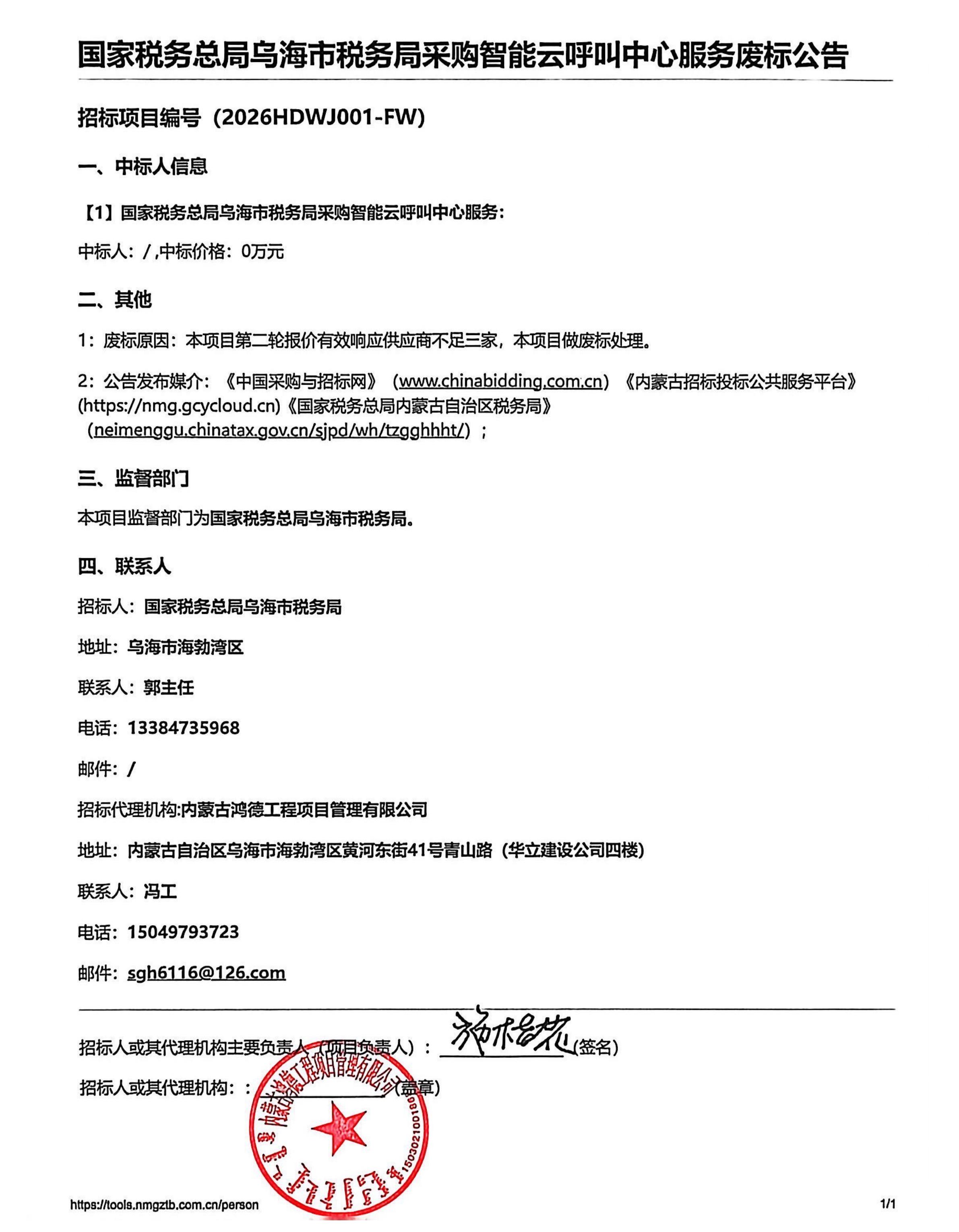 国家税务总局乌海市税务局采购智能云呼叫中心服务废标公告