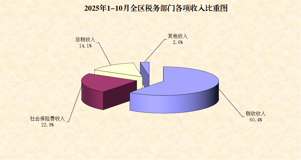 2025年1-10月,全区税务系统组织各项税费收入5023.2亿元,税务部门组织税收收入3032.2亿元,社会保险费收入1149.5亿元,非税收入708.5亿元,其他收入133.0亿元。此外,海关代征税收141.3亿元,办理出口退税42.7亿元。
