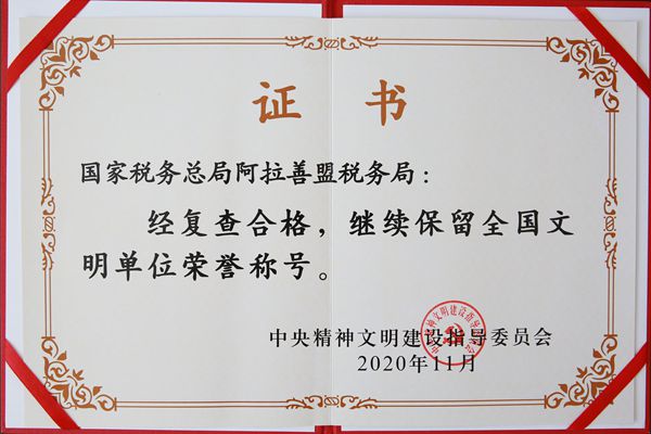 在此基础上,阿拉善盟税务局继续将精神文明创建工作摆在突出位置,局党委给予高度重视,提供大力支持。党委率先垂范,定期研究,督促指导。2020年根据《往届全国文明单位复查办法》规定,阿拉善盟税务局符合机构改革中合并重组的复查认定标准,全局人员积极响应,始终把精神文明创建工作与日常工作结合起来,充分利用工作特点,将精神文明创建工作紧密融合到日常工作中。阿拉善盟税务局党建办全面贯彻落实中央文明办关于开展精神文明创建工作的精神,积极开展创建复查认定工作,2020年阿拉善盟税务局机关以详实的创建资料、丰富的走廊文化、完善的活动设施以及到位的氛围营造受到各级文明委的一致认可,顺利通过“全国文明单位”复查认定,近日被授予复查认定合格证书。
