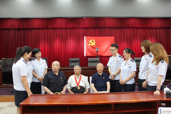 东胜区税务局组织全体职工和退休老党员集中收看庆祝中国共产党成立100周年大会,并邀请三位退休老党员、一位新入党青年税干谈自己的入党初心。89岁光荣在党68周年的退休老党员丁峨山表示退休不褪色,要永葆共产党员的纯洁本色;84岁的退休老党员苏增昌给青年党员讲了赵一曼、杨靖宇等革命先烈的故事,深情寄语青年党员们;79岁的退休老党员董治国讲了切身感受,激励青年在新的征程中不断努力奋斗。