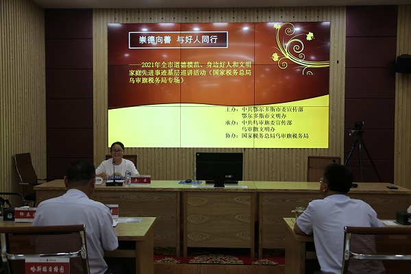 乌审旗税务局邀请乌审旗文明办开展以“崇德向善 与好人同行”为主题的鄂尔多斯市道德模范、身边好人和文明家庭先进事迹基层宣讲活动。宣讲团老师讲述了道德模范身边好人和文明家庭感人肺腑的事迹,一段段令人动容的故事、一张张感人至深的照片、一句句催人奋进的话语引起广大税务干部的强烈共鸣,使全体参会人员接受了一次深刻的心灵洗礼和党性教育。