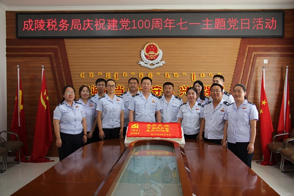 恩格贝生态示范区税务局积极参加恩格贝生态示范区组织的举行庆祝建党100周年暨“忆政治生日、永远跟党走”庆“七一”活动。活动在全体党员庄严的宣誓中开始,示范区党组书记、党龄最长的党员和2021年“两优一先”代表共同为政治生日蛋糕剪彩,赠送政治生日纪念册,为党员们过集体政治生日,全体党员高唱《没有共产党就没有新中国》,表达着对党最真挚的情感和祝福。