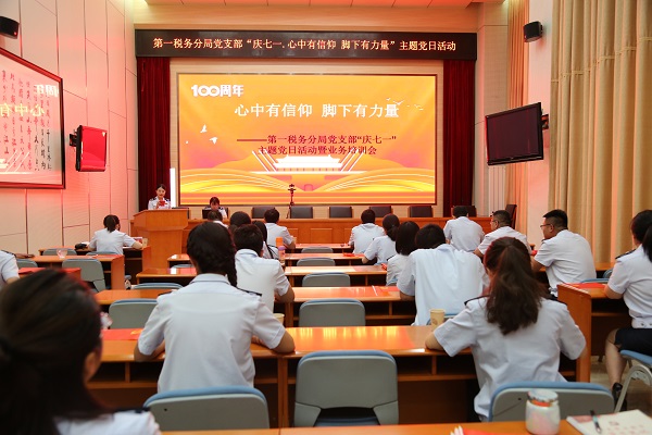 鄂尔多斯市税务局第一税务分局开展“庆七一·心中有信仰 脚下有力量”主题党日活动暨业务培训会。全体党员共同重温入党誓词,部分党员代表深情配乐朗诵了《习近平总书记在“七一勋章”颁奖仪式上的讲话》,讴歌革命先辈和共产党人的高尚品质和崇高精神。为党点燃生日蜡烛,并高唱《没有共产党就没有新中国》,共庆党的百年华诞,共抒爱国爱党深厚情怀。欧阳河副局长为全体党员干部讲授大企业税收业务知识,促进党建与业务深度融合。