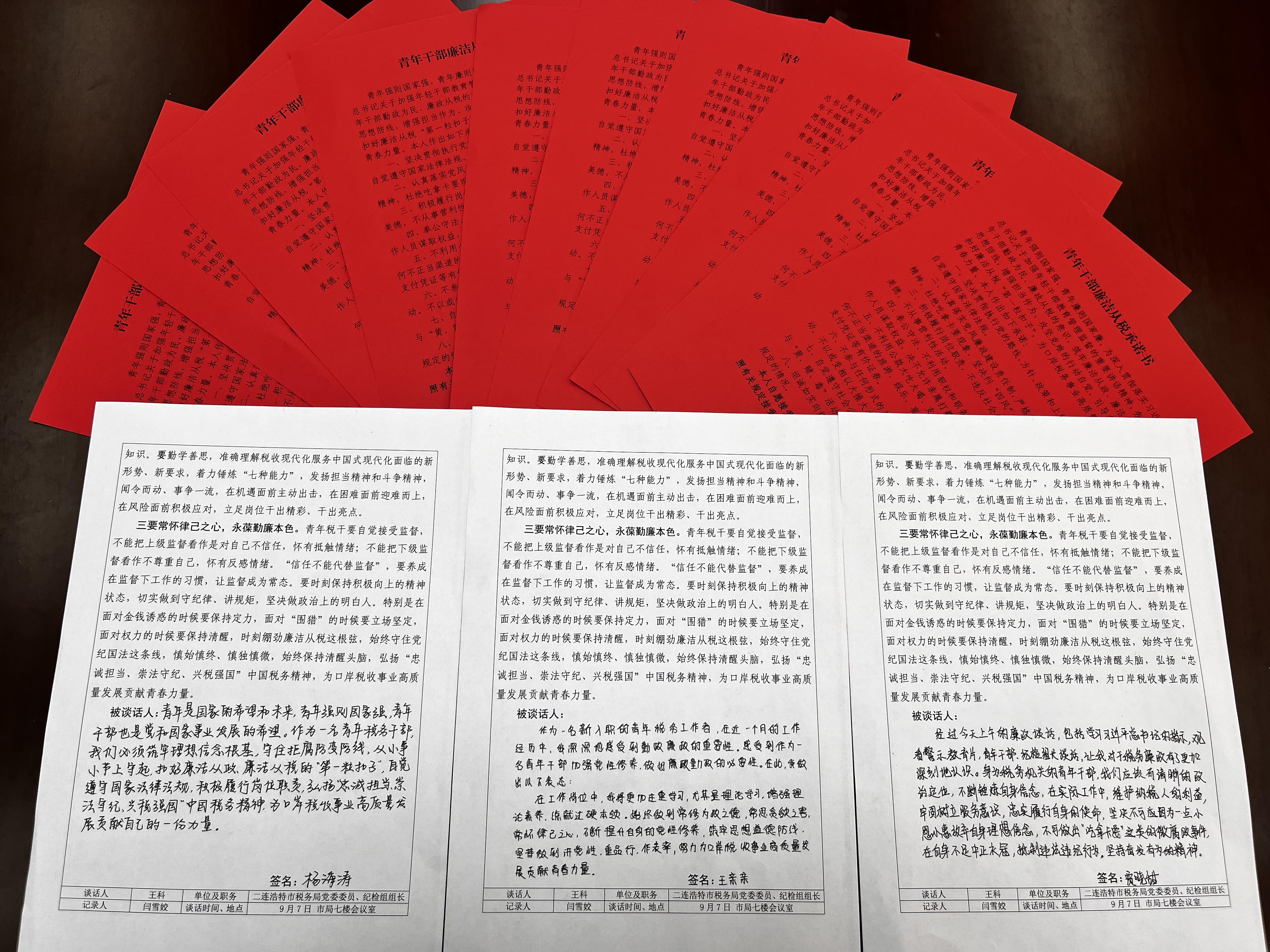 以诺践廉,签订一份廉洁从税承诺。税务青年作为税收事业的生力军,清廉相伴、筑梦未来,至关重要。二连浩特市税务局组织28名干部签订《青年干部廉洁从税承诺书》。从政治信念、党纪国法、税纪新风、廉洁从税、履职担当、严于律己等八个方面公开承诺,引导干部守住本心、守住小节、守住关卡,让青春在推动口岸税收事业高质量发展的新征程上大放光彩。