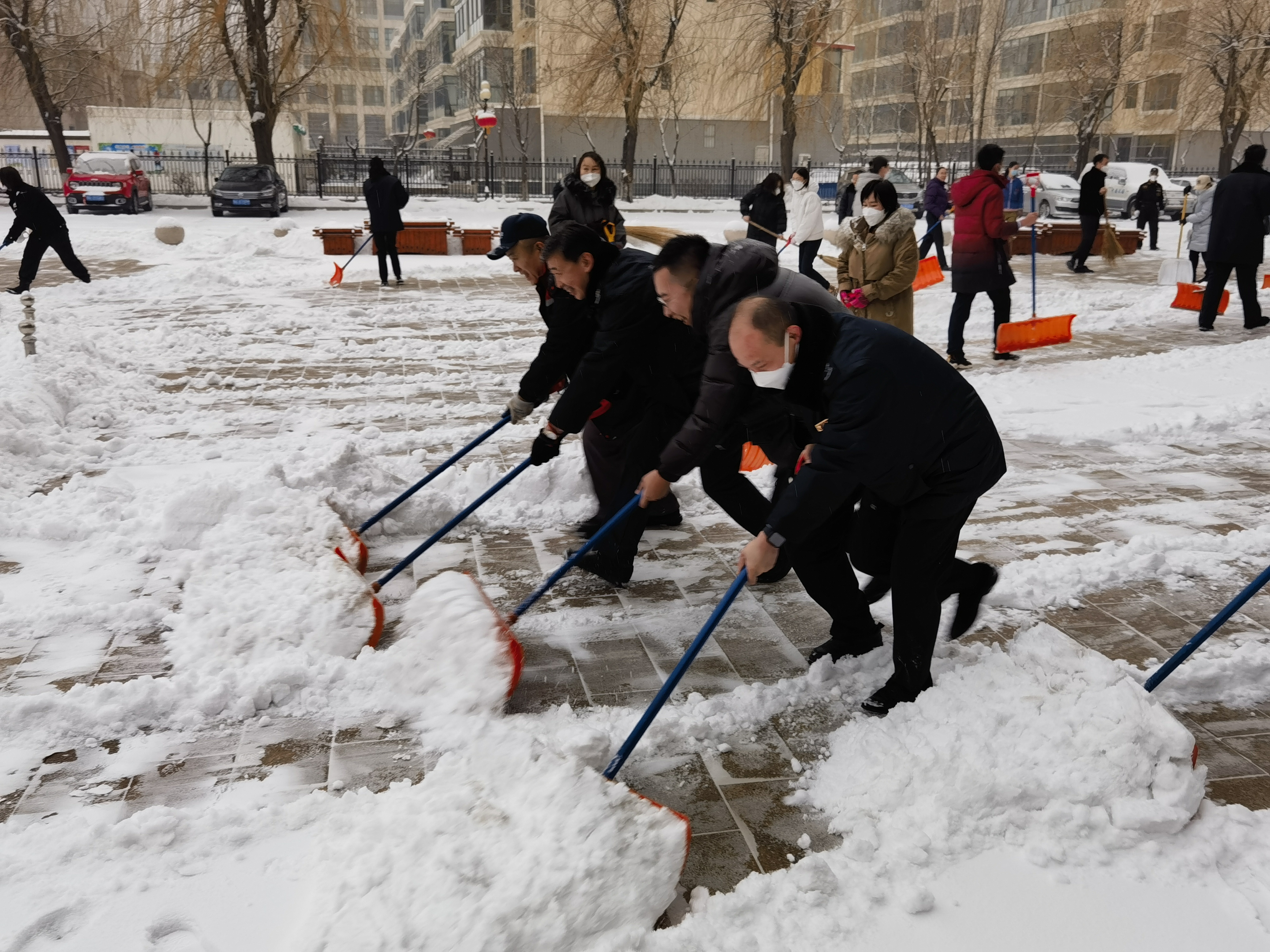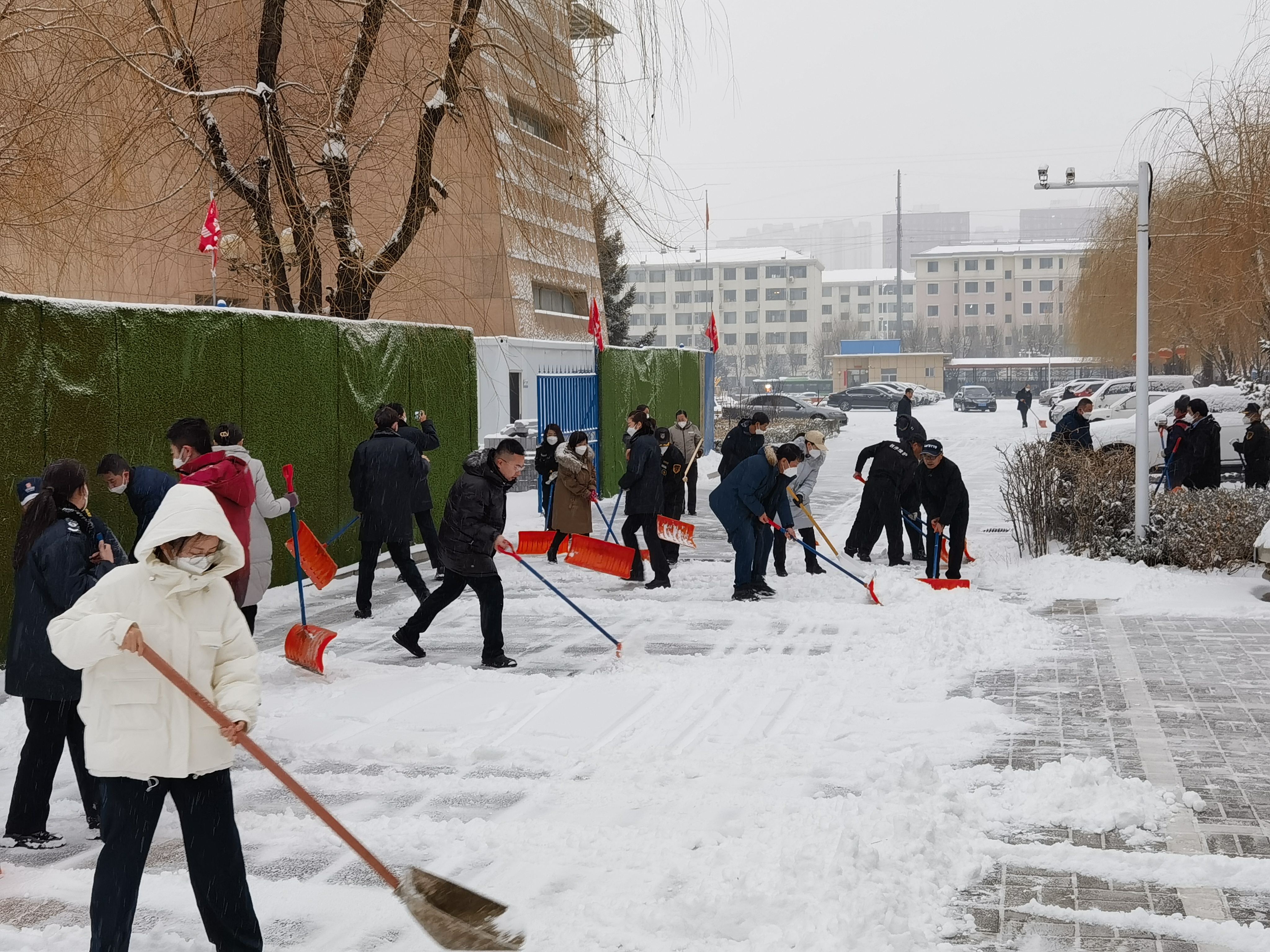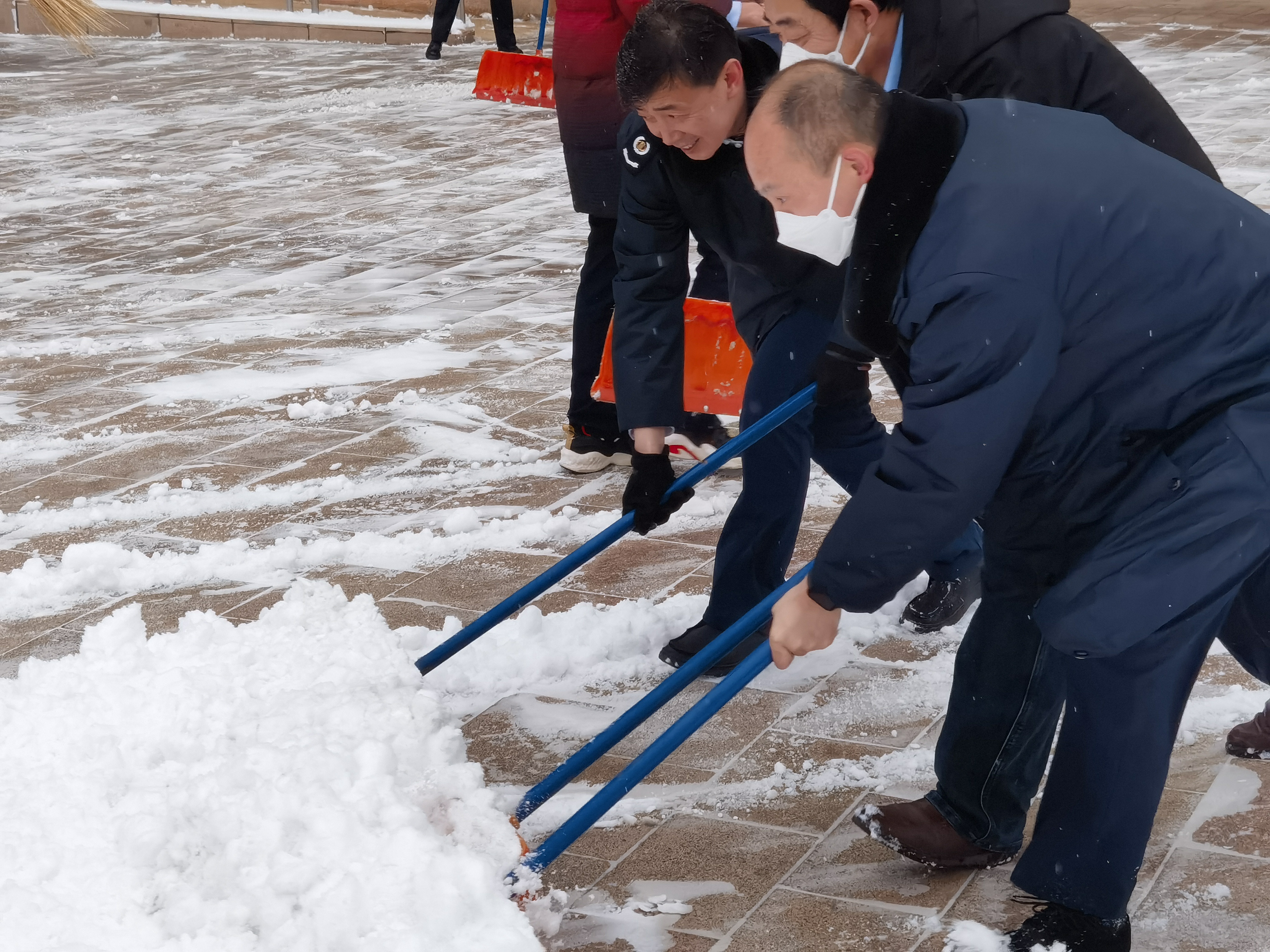冰天雪地里,在分局领导班子带动下,大家奋勇当先,挥舞着刮雪板、扫帚等除雪工具,你铲我扫,一幅热火朝天的景象,一点点将积雪铲起来集中堆放。虽然寒风凛冽、天寒地冻,却也丝毫没有影响扫雪除冰的积极性,握在手中的工具也不曾休息。虽然人人都忙出一身的汗,但没有一个人喊累,反而在雪地中充满了欢声笑语。在欢快的气氛下,一个个忙碌的身影在雪地里构成了一道靓丽的风景。在所有人共同的努力下,经过1个多小时的奋战,院内、门口、行车道和停车位等各处积雪全部清扫干净。
