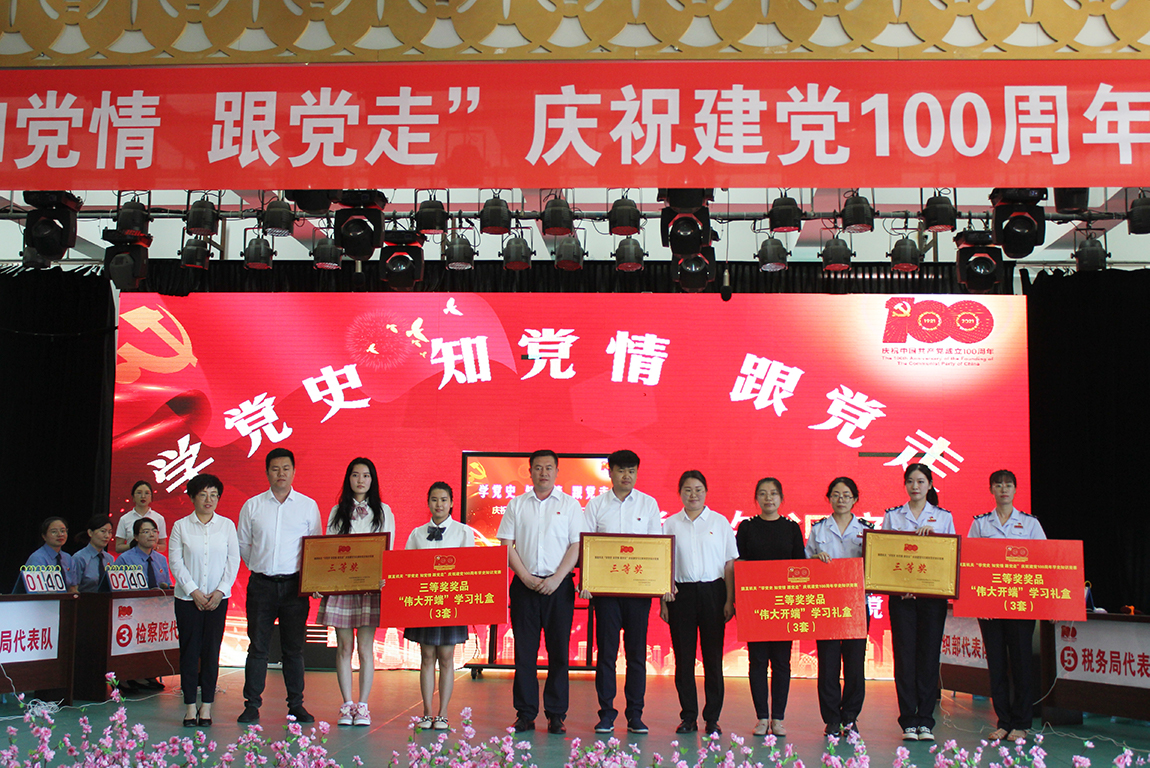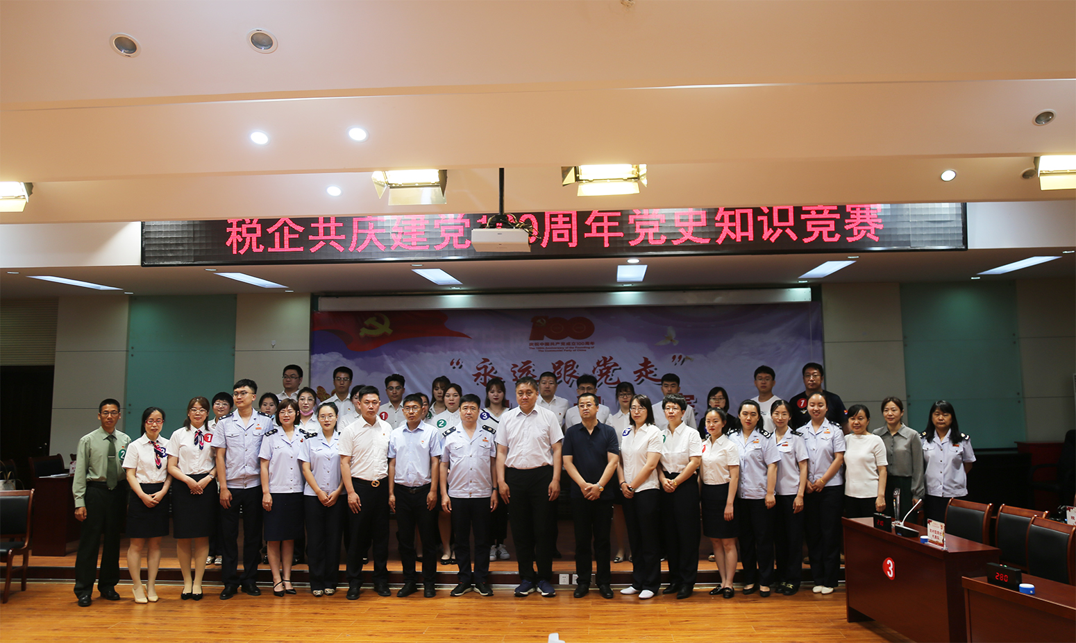 阿荣旗税务局:国家税务总局阿荣旗税务局与齐鲁制药(内蒙古)有限公司呼伦贝尔分公司、国网内蒙古东部电力有限公司阿荣旗供电分公司、阿荣旗农村信用合作联社等八家企业共同举办了“永远跟党走”——阿荣旗税企同庆中国共产党成立100周年党史知识竞赛,深化党史学习教育,迎接建党100周年,推动党员干部职工学党史、悟思想、办实事、开新局。共青团阿荣旗委员会副书记栾辰、阿荣旗税务局党委班子成员和八家企业的领导班子成员、党员及职工代表120余人参加了此次活动。