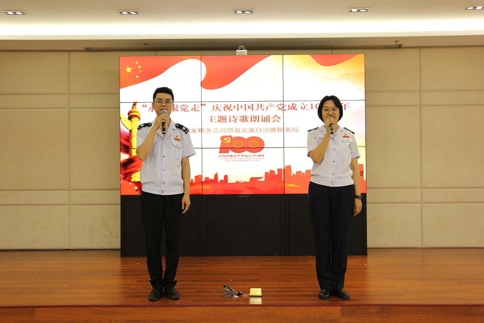 鄂温克族自治旗税务局: 国家税务总局鄂温克族自治旗税务局组织党员干部开展“永远跟党走”庆祝中国共产党成立100周年主题诗歌朗诵会,进一步营造党史学习教育的红色氛围。该局党委班子成员共同朗诵了《百年梦党旗红 铭记历史 踏征程》,带领大家追忆百年党史,缅怀先辈英烈。一首首红色诗歌,回顾中国共产党的发展历程,铭记中国共产党党员的责任,赢得现场观众阵阵掌声。活动让全体党员群众共同体验了一场传播红色力量的诗歌文化之旅,引导全体党员干部和群众不断把党史学习教育成果转化为“我为群众办实事”的实际行动、转化为推动税收工作和税收改革发展的实际成效。
