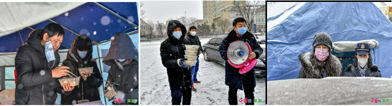 社区的条件都比较简陋,很多老旧小区没有物业没有门卫,只能靠流动测温车取暖。但是来自各方的支持和援助给大家带来了温暖!有临时的铁皮摊位车和蓝色铁皮房,有街道的领导想方设法借来的帐篷,有局领导们和支部书记们送来的口罩、暖手宝、食物和热水等,有餐馆为志愿者们捐赠的上千份盒饭,有烘焙店赠送的上千个面包,有商会捐助的2000对热帖,有通辽市义工协会捐助的200个自制隔离面罩,还有本局内部职工捐赠的防疫物品和社区居民个人提供的桌椅、免费充电和热水……