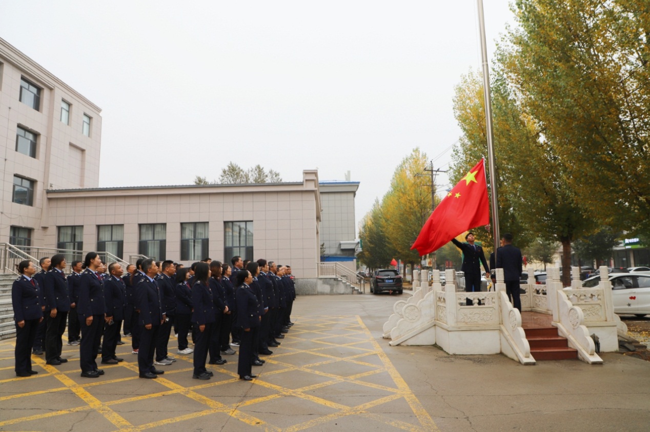 国庆节后上班首日,察右前旗税务局举行升国旗仪式,干部职工庄严肃立,面向国旗行注目礼。