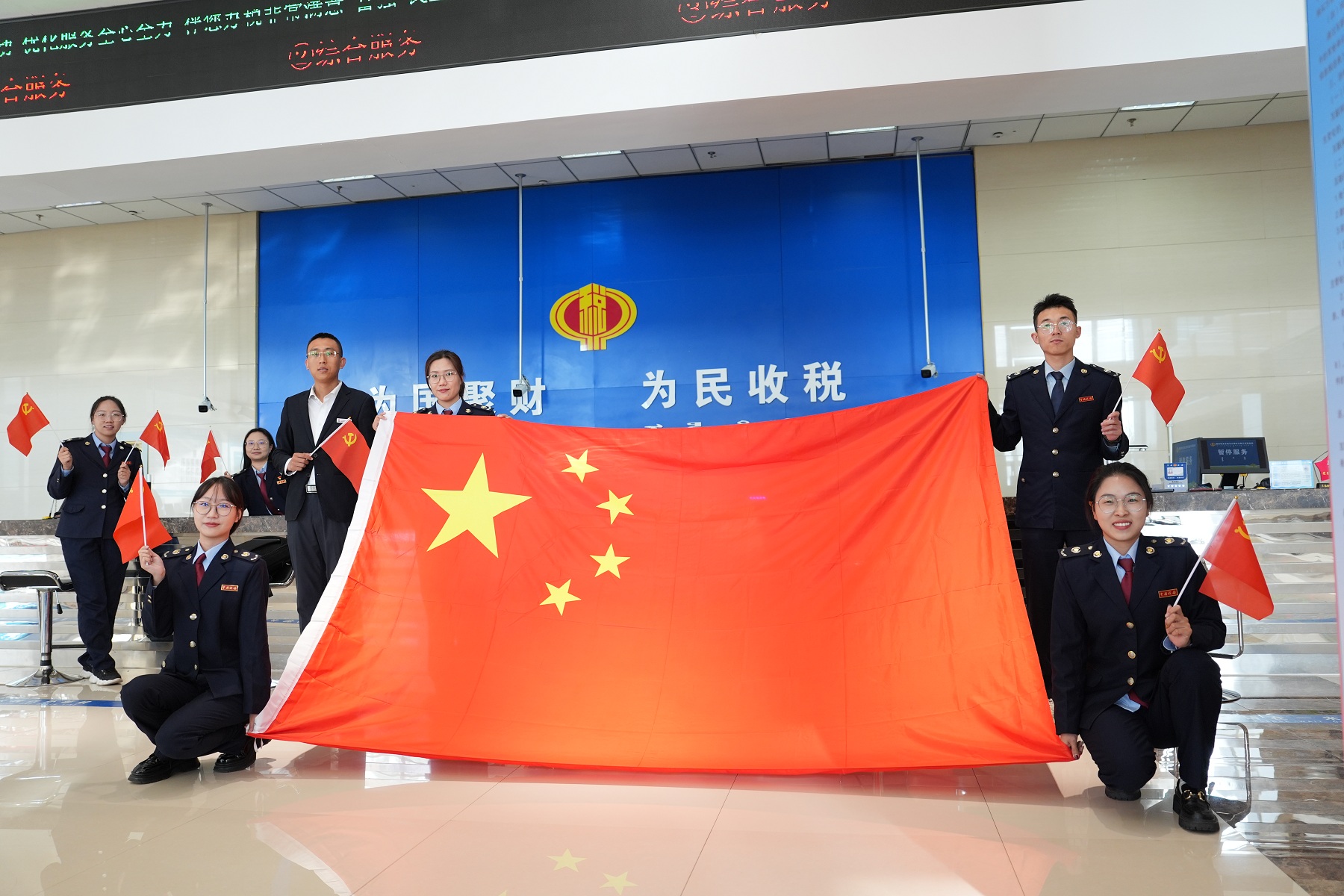 集宁区税务局青年税干与纳税人手持鲜艳的五星红旗,在办税服务厅留下合影,镜头定格下他们真诚的笑容,凝聚起税务人与纳税人对祖国的深情祝福。