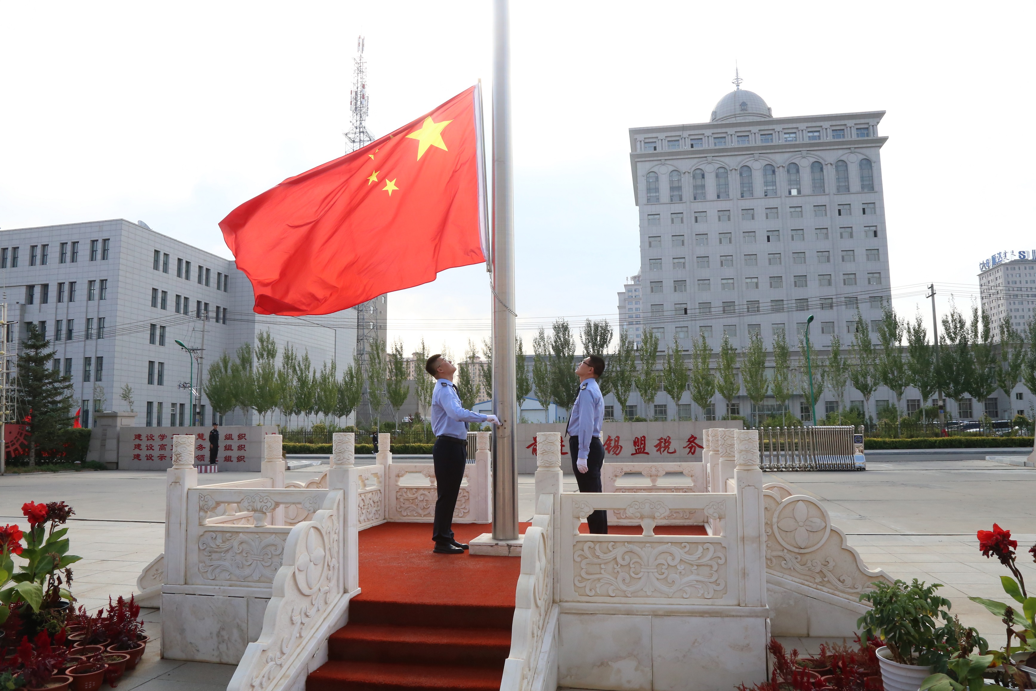 伴着雄壮有力的国歌,鲜艳的五星红旗冉冉升起,参加仪式的税务干部肃然而立,全体人员向国旗行注目礼,齐唱中华人民共和国国歌,用最简洁庄重的形式表达对祖国的无限热爱和崇高敬意。