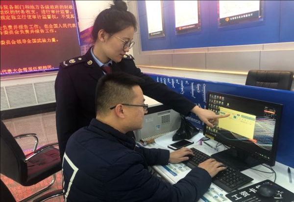 ↑2月1日,国家税务总局满洲里扎赉诺尔区税务局人员正在辅导享受税费优惠政策的纳税人通过电子税务局进行申报。