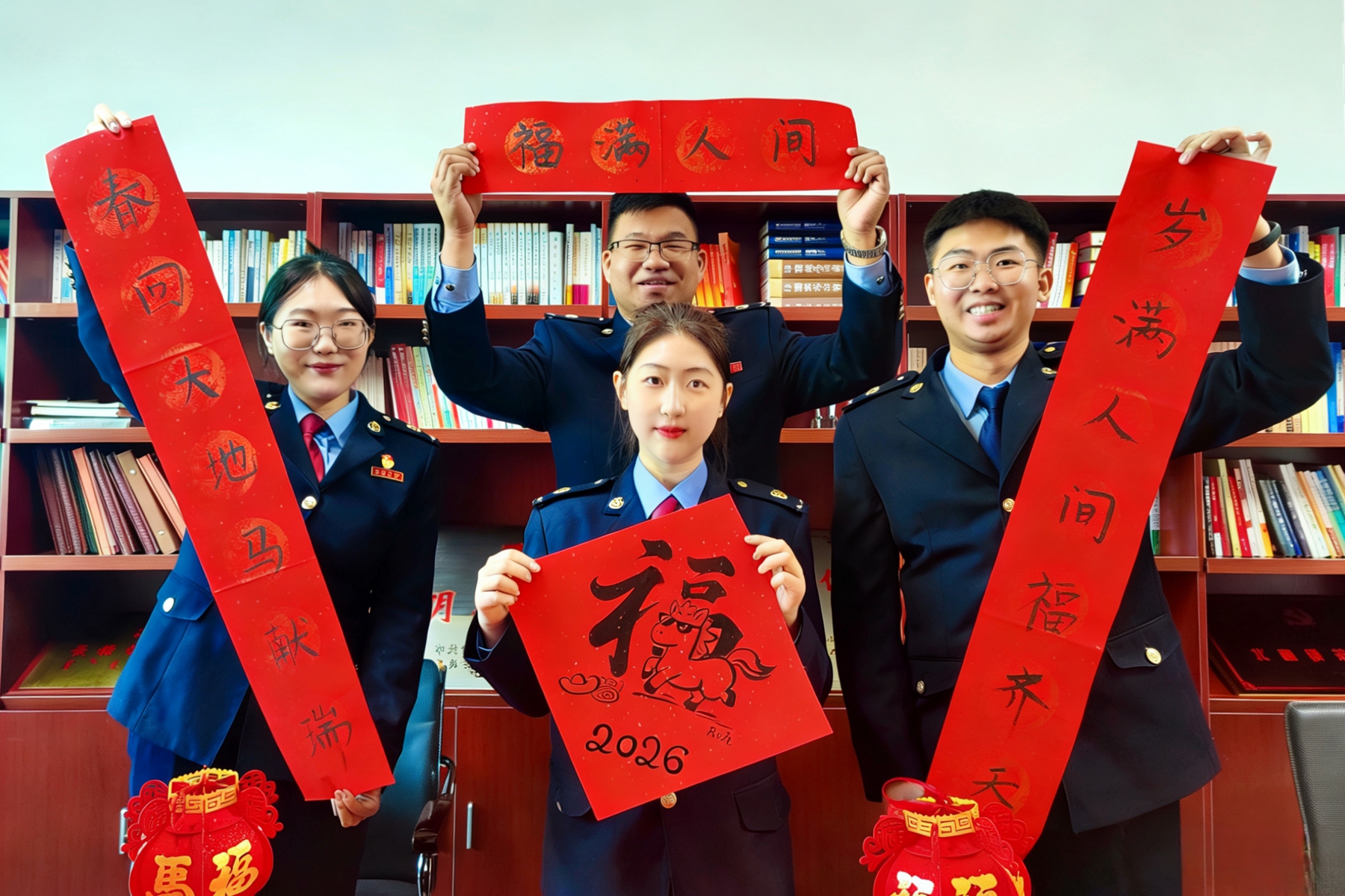 二连浩特市税务局乌兰察布•二连浩特国家物流枢纽园区税务分局的干部职工开展元旦主题活动,挥毫泼墨写春联、送福字,在墨香四溢中感受传统节日的喜庆氛围,以热忱之态迎接2026年到来。(张晓庆 摄)