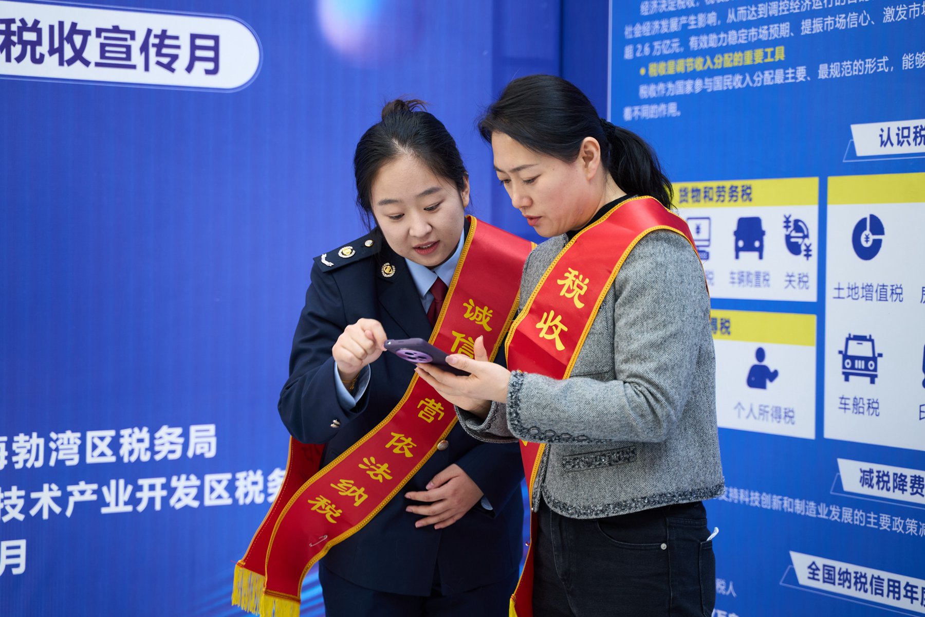在兴安盟,经济技术开发区税务部门青年税干组成税宣骑行小队,穿梭于城市地标之间,沿途向居民、游客发放税宣“小宝典”,辅导个人所得税汇算、社保缴费等操作流程,将单车打造为移动的“税费咨询台”。(安俊武 摄)
