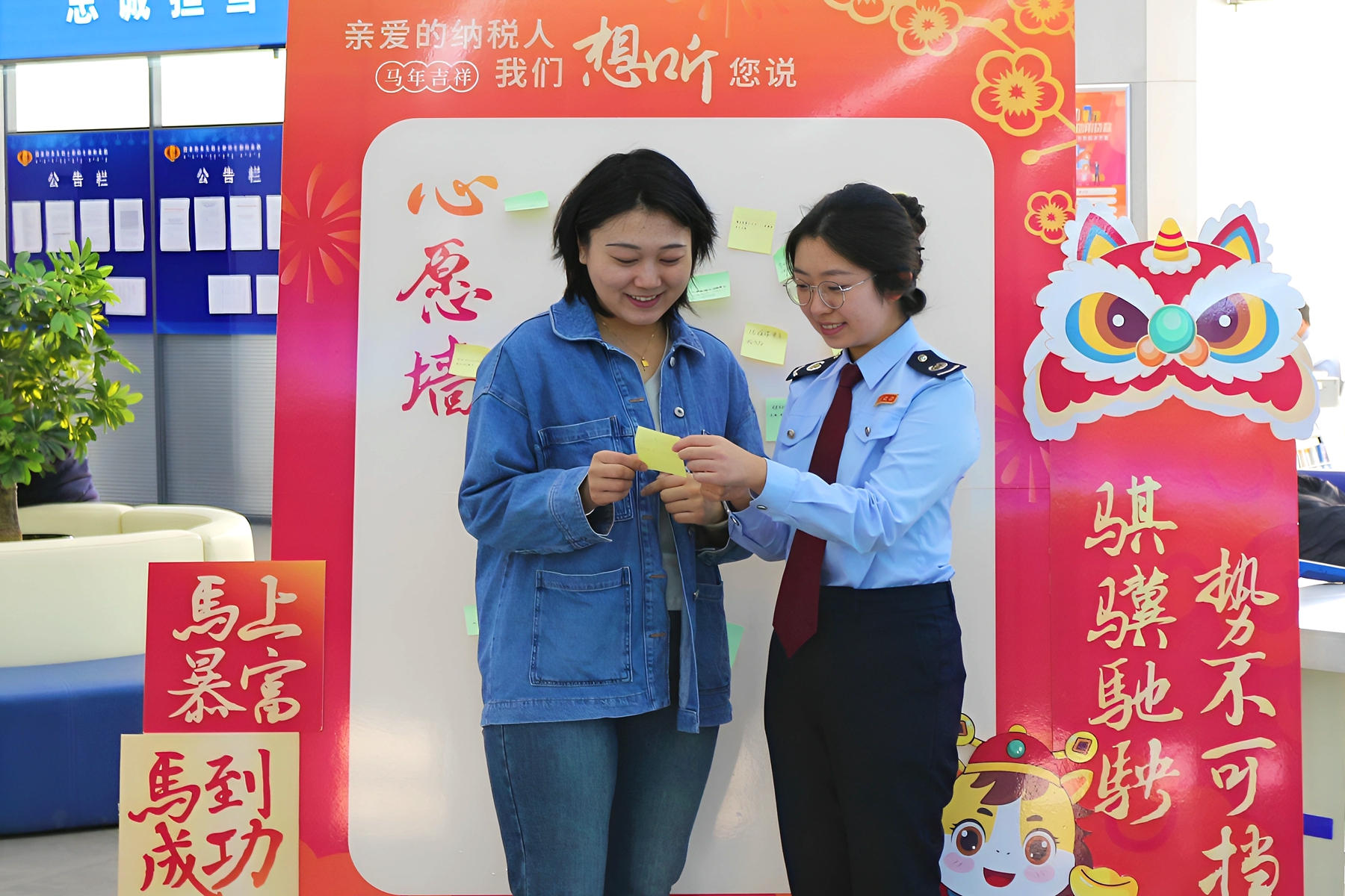 在呼和浩特市,土默特左旗税务部门在办税服务厅设立“亲爱的纳税人,我们想听您说”互动展板,收集新年寄语,听取意见建议,与纳税人缴费人共赴新年。(潘蕊 摄)