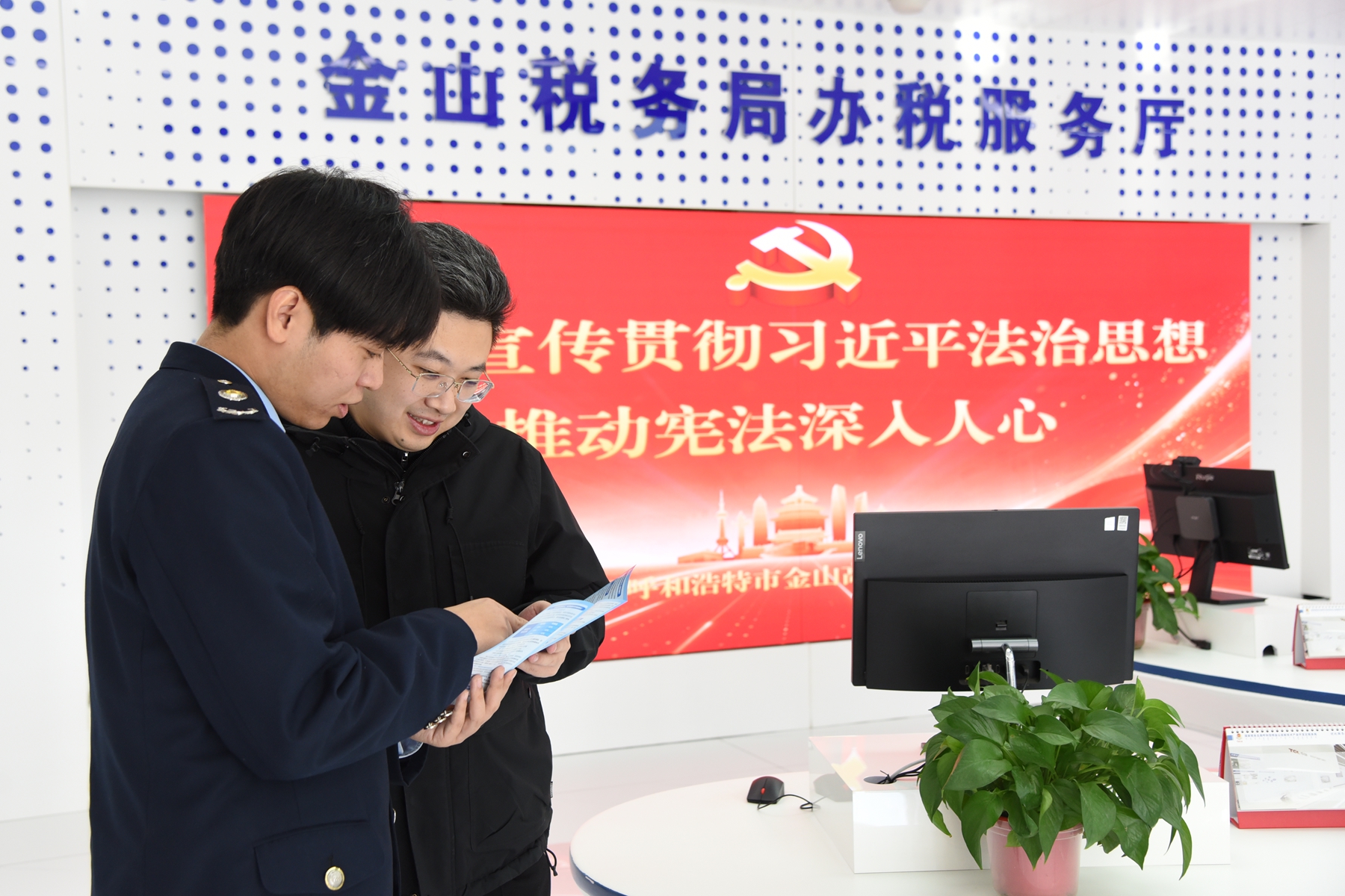 呼和浩特金山高新技术产业开发区税务局通过LED显示屏滚动播放宪法宣传标语及《合规经营 诚信纳税》等公益广告,让纳税人缴费人在办税过程中直观感受宪法精神与税收法治内涵。(杨帅 摄)