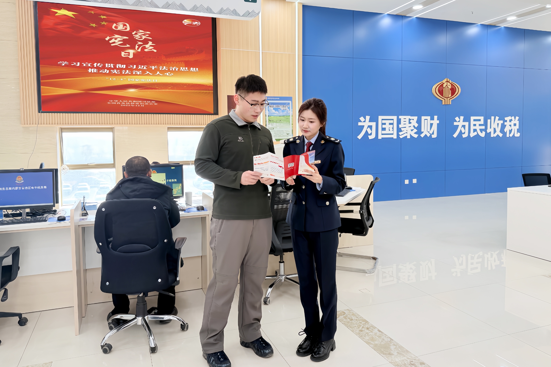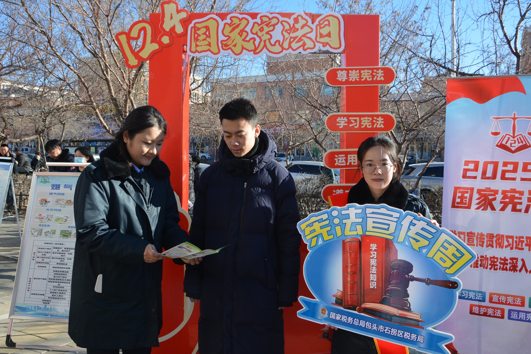 包头市石拐区税务局以“传、讲、看”多元化形式开展宪法宣传活动,组织青年税干走进辖区商业中心,通过发放资料传知识、现场解读讲要点、直观展示看亮点等形式,向社区居民宣传与群众生活息息相关的法律法规,将惠民政策与法律知识精准送达群众手中。(陈茹静 摄)