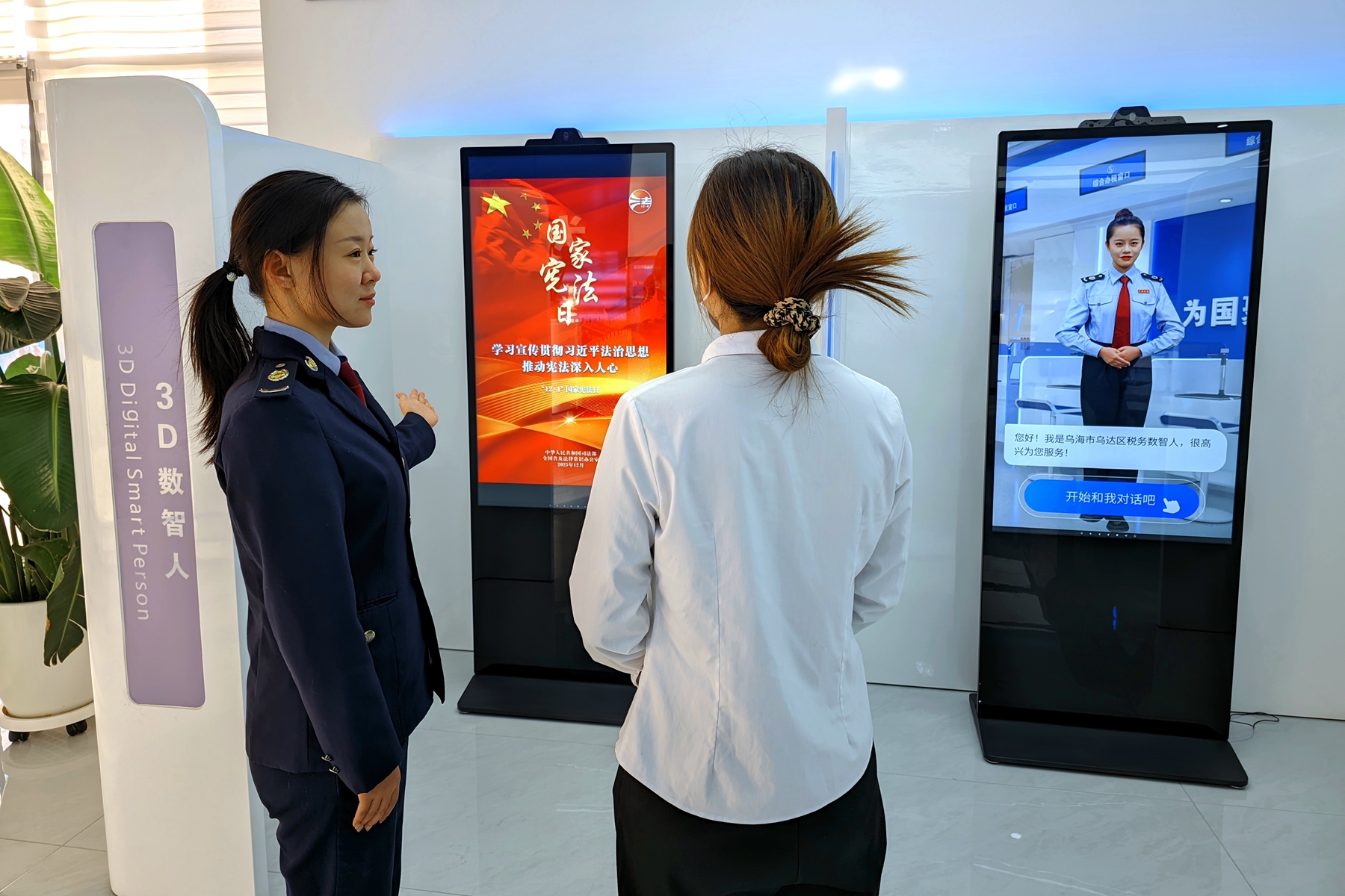 乌海市乌达区税务局在办税服务厅以3D数智人播展活动海报宣传习近平法治思想与宪法规定,普及税费法规政策,营造依法纳税氛围。(郝炜浩 摄)