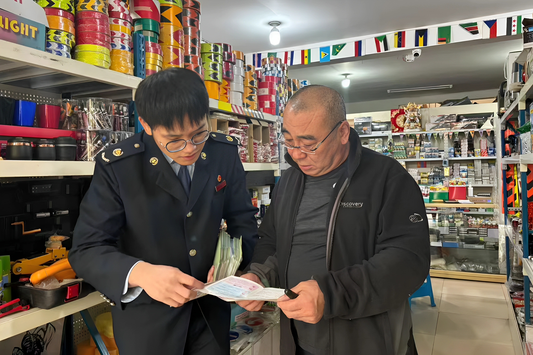 二连浩特市税务局青年干部走进商户,通过面对面讲解将法治理念融入税费政策解读中,树牢经营主体依法诚信纳税意识。(胡冬辉 摄)