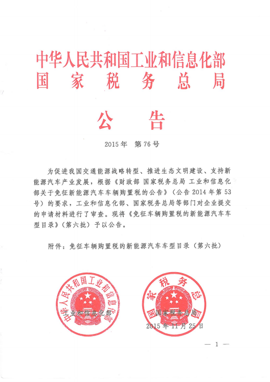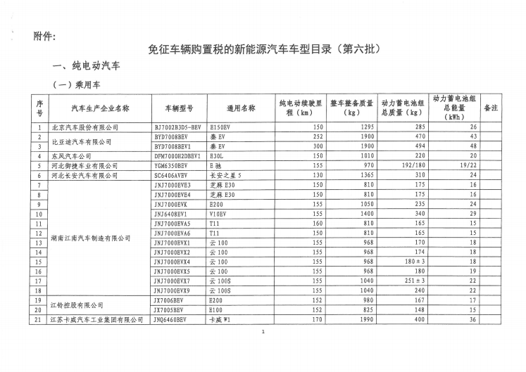 《免征车辆购置税的新能源汽车车型目录》(第六批)