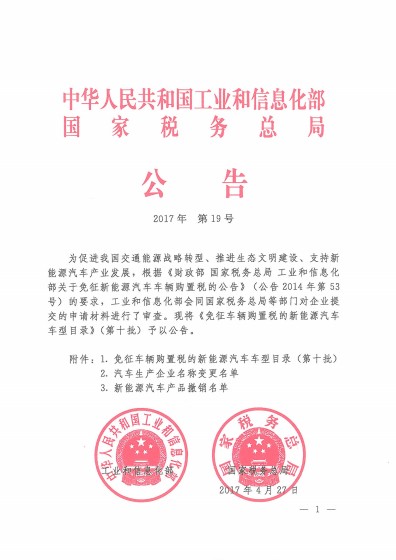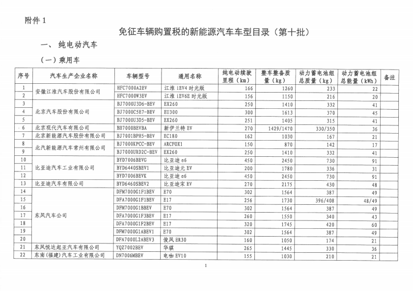 免征车辆购置税的新能源汽车车型目录(第十批)