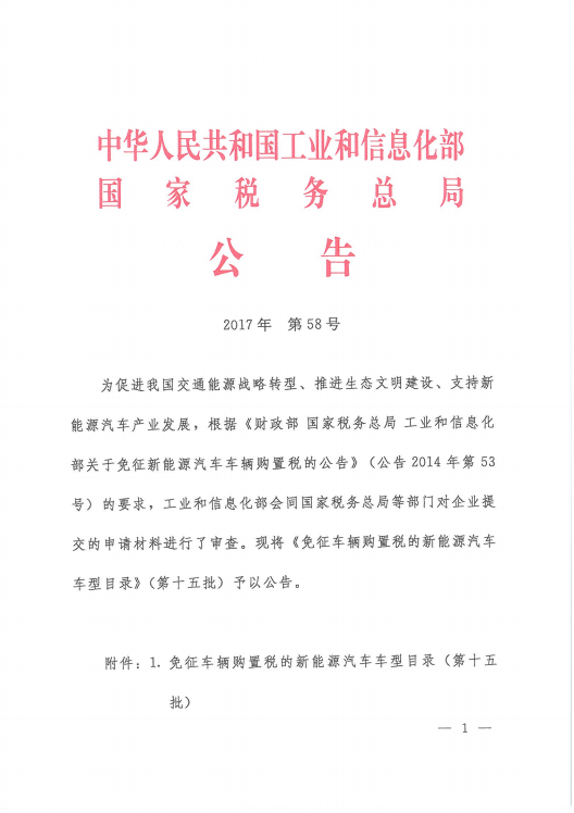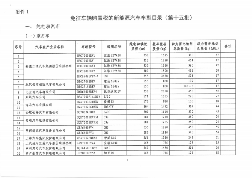 免征车辆购置税的新能源汽车车型目录(第十五批)