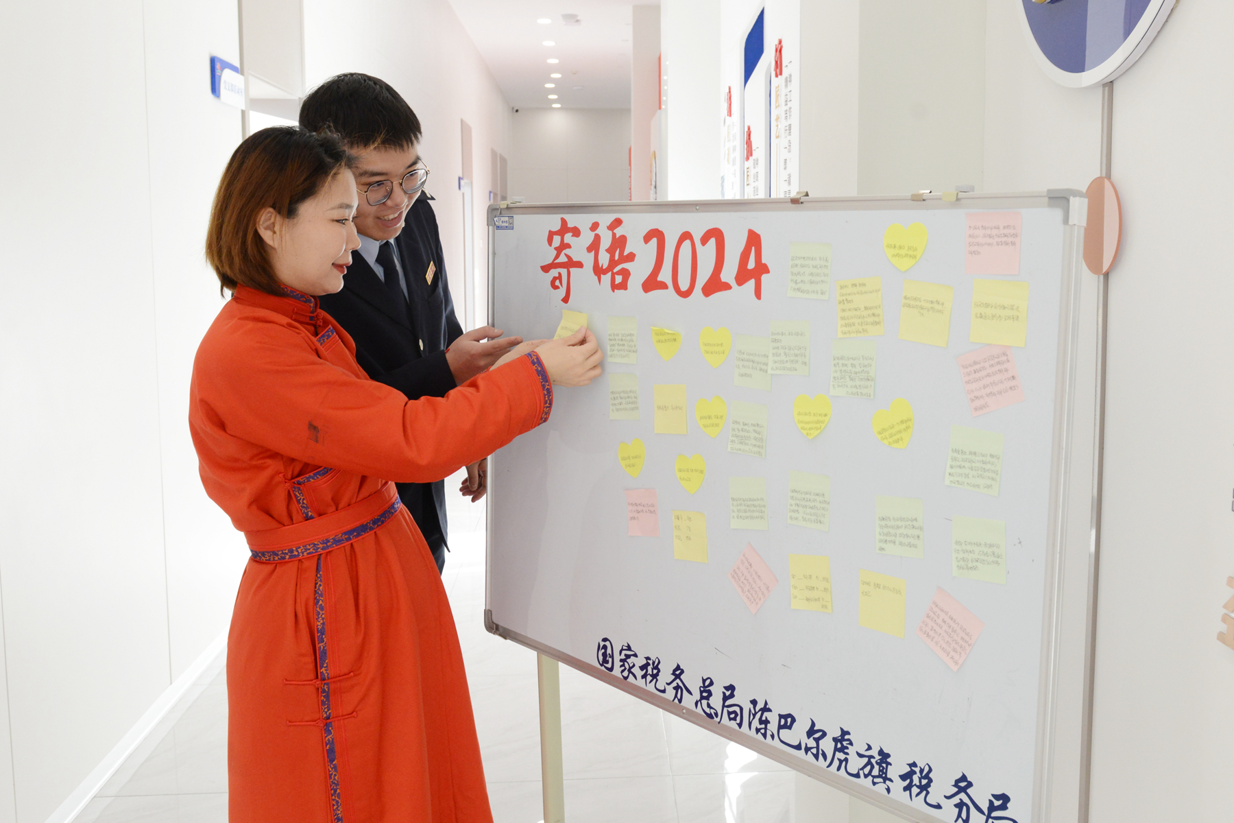 新年新期待,国家税务总局陈巴尔虎旗税务局设置“寄语2024新年新寄语”留言板,邀请纳税人缴费人写下对税收工作的新期许,以便更好地了解纳税人缴费人所思所想所盼,在新的一年将顺民意的事办好、暖民心的事办实,持续提升纳税人缴费人满意度和获得感。(韩晓 摄)