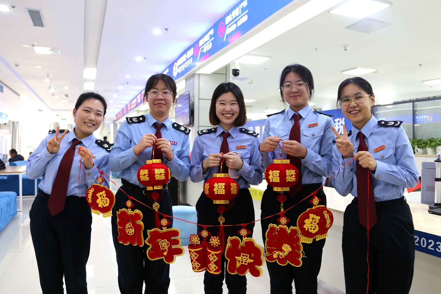 元旦佳节来临之际,国家税务总局呼和浩特市回民区税务局组织青年税务干部在“枫桥式”开放办税服务厅为广大纳税人缴费人送上新年祝福,与纳税人缴费人共庆元旦,以饱满的热情和昂扬斗志迎接2024年。(曹思源 摄)