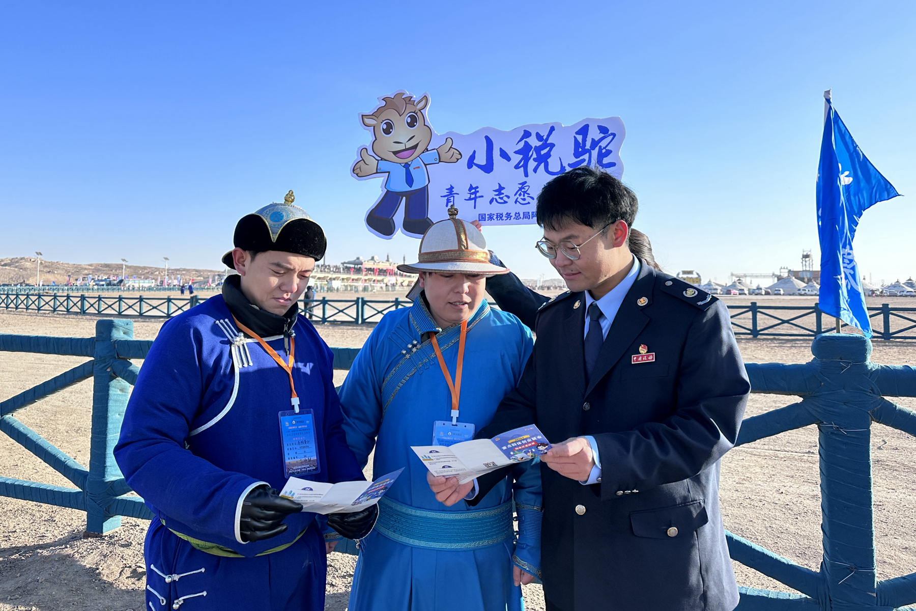 新年将至,阿拉善万峰驼那达慕大会在阿拉善右旗开幕,为助力辖区内驼产业、文旅产业发展,阿拉善右旗税务局“小税驼”青年志愿服务队到现场开展纳税宣传、志愿服务,以独特的方式迎接新年到来,为2024年全局工作开好局、起好步提振精神,并为纳税人缴费人送上美好的节日祝福。(李戈羽 摄)