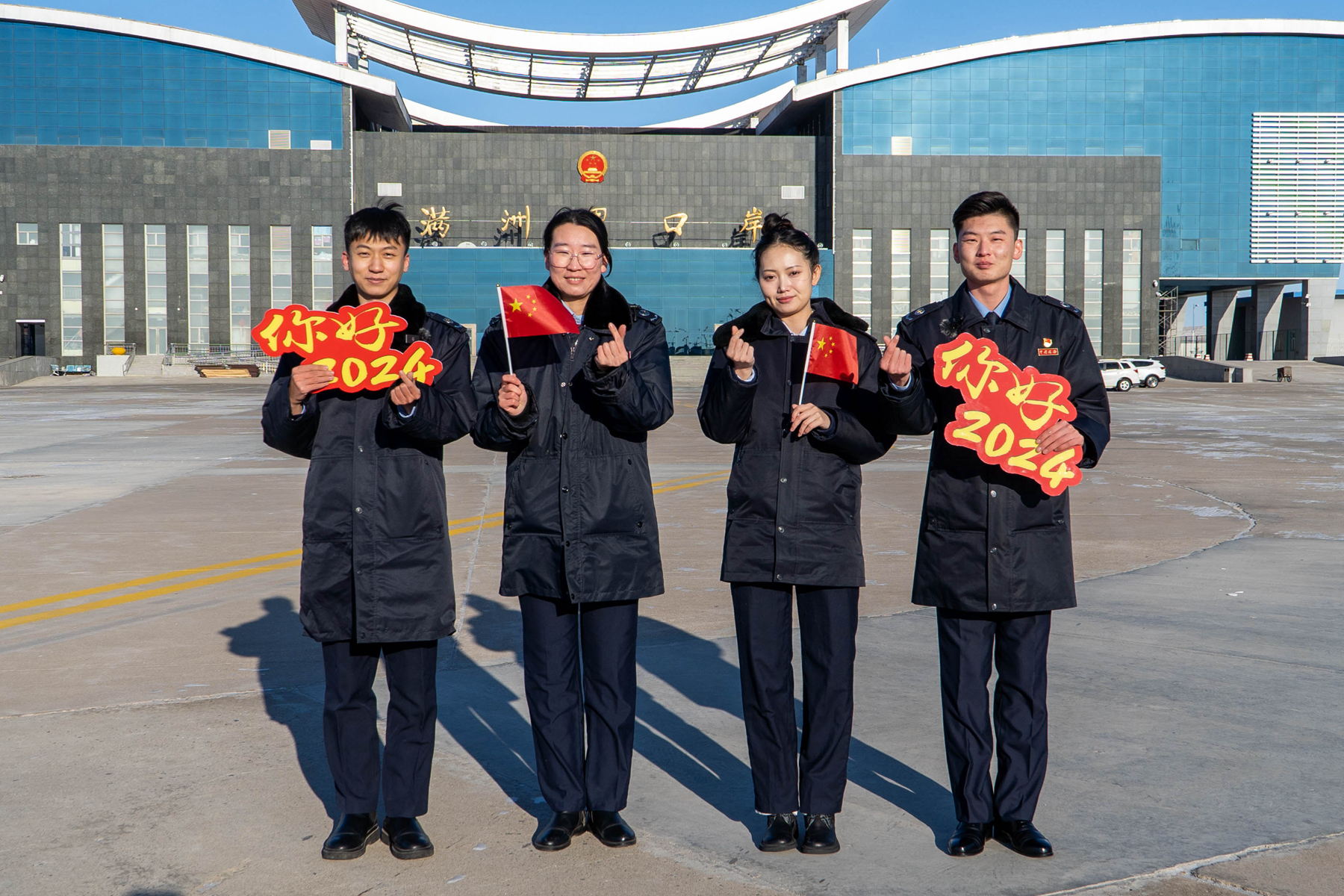 2024年元旦佳节到来之际,在满洲里公路口岸,满洲里市税务青年迎新年、庆元旦,向纳税人缴费人送上祝福。新的一年,满洲里市税务部门将积极推广“税路通•北疆行”跨境税费服务品牌,持续优化跨境办税服务,大力支持外贸企业“走出去”,努力服务好建设“中蒙俄经济走廊”,高质量服务国家向北开放。(王美琦 摄)